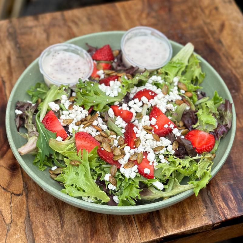 Mixed greens with sliced strawberries, toasted pepitas & crumbled goat cheese served with house poppy seed dressing *Gluten Free, Vegetarian