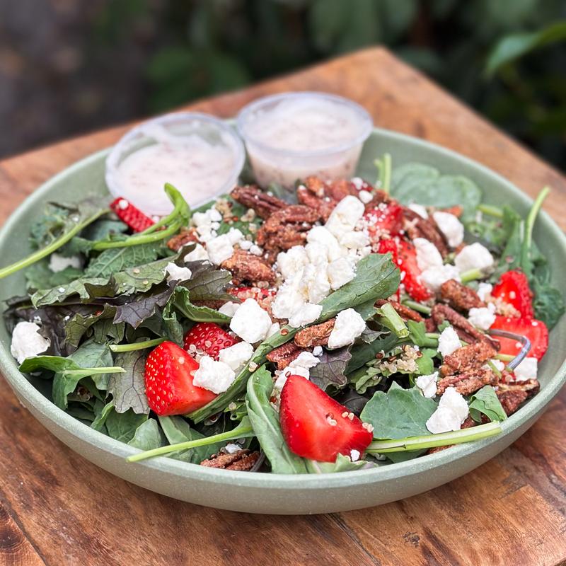 Kale & mixed greens with sliced strawberries, candied pecans, quinoa & crumbled feta served with house poppy seed dressing *Gluten Free, Vegetarian