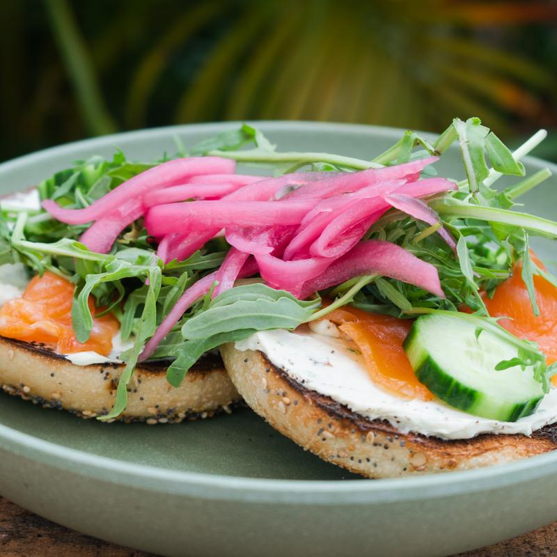 Everything bagel topped with garlic chive cream cheese, house cured salmon, cucumber, pickled onion & arugula