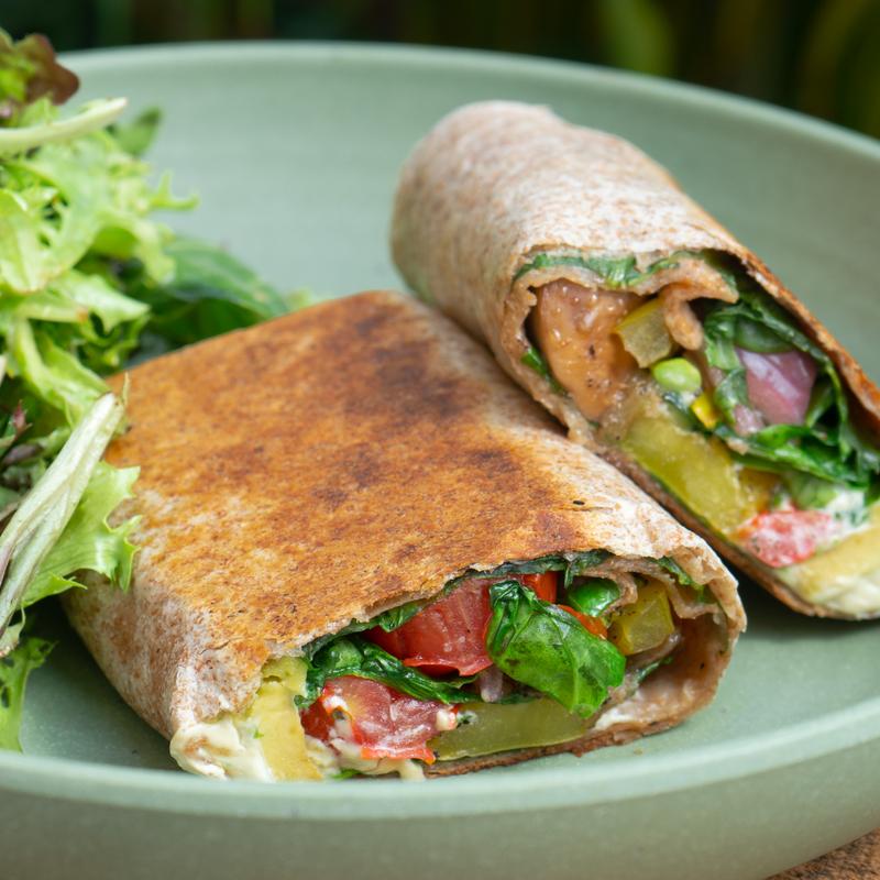 Medley of seasonal roasted veggies with avocado, pickled onions, garlic chive cream cheese & spinach pressed in a whole wheat wrap *Vegetarian