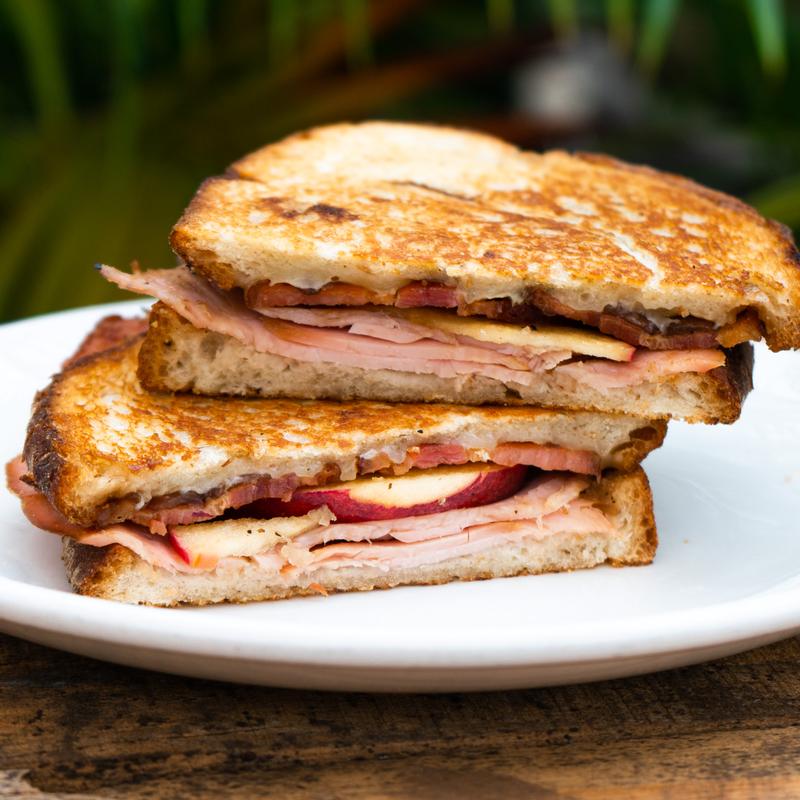 Deli ham with white cheddar cheese, sliced apple, bacon (2) & house made balsamic onion jam on pressed sourdough