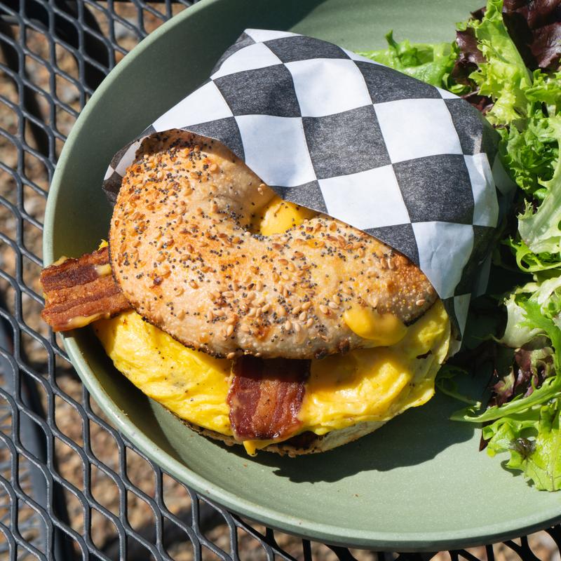 2 Scrambled eggs, bacon (2) & American cheese on an everything bagel