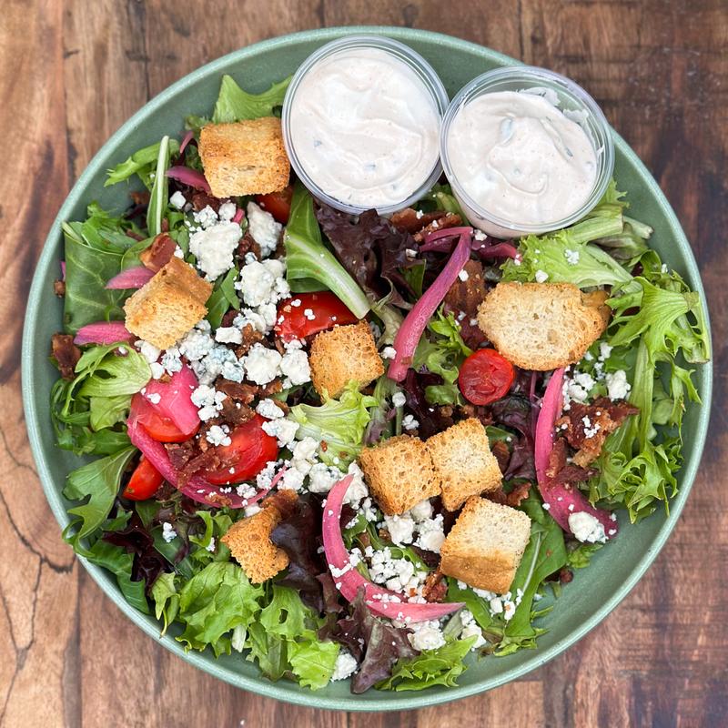 Mixed greens with crumbled bacon, gorgonzola, cherry tomatoes, pickled onions & focaccia croutons served with house buttermilk ranch dressing *Vegetarian