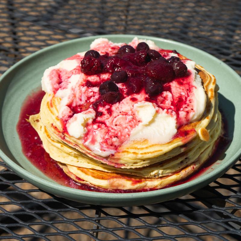 4 Ricotta pancakes stacked with mix berry compote & vanilla mascarpone. Topped with powdered sugar *vegetarian