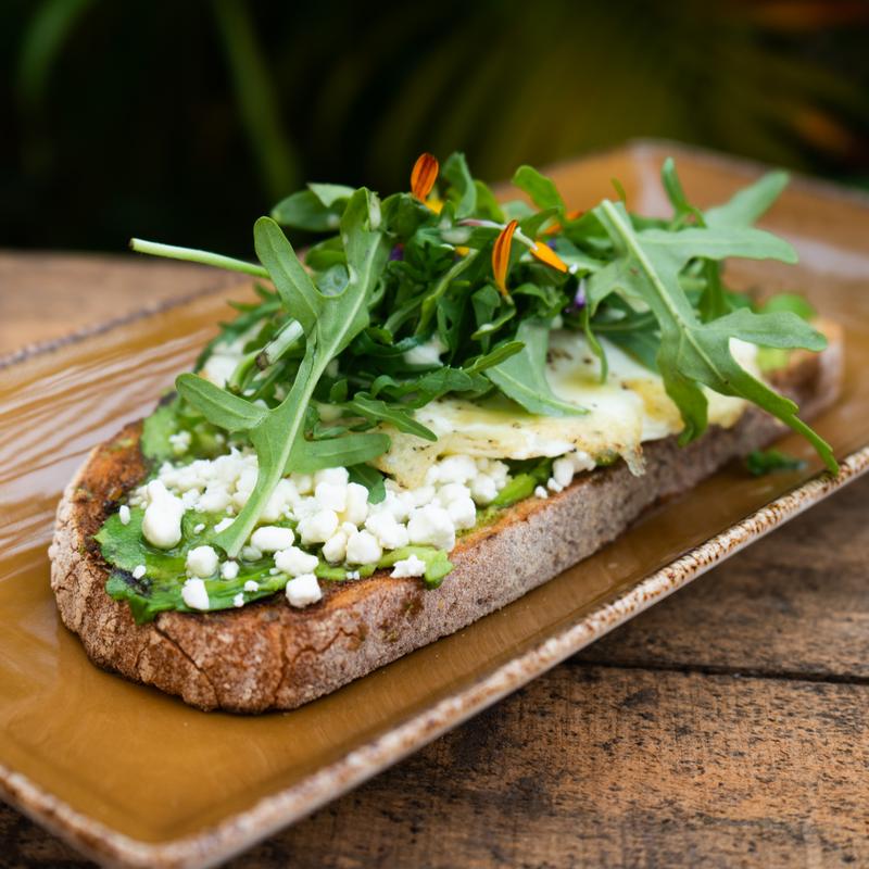 Avocado, goat cheese, honey, one over easy egg on sourdough topped with dressed arugula *Vegetarian, Gluten Free Available