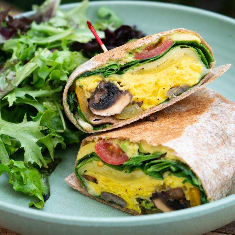 2 eggs scrambled, gouda, roasted veggies, spinach, tomato, avocado, red onion on a whole wheat wrap