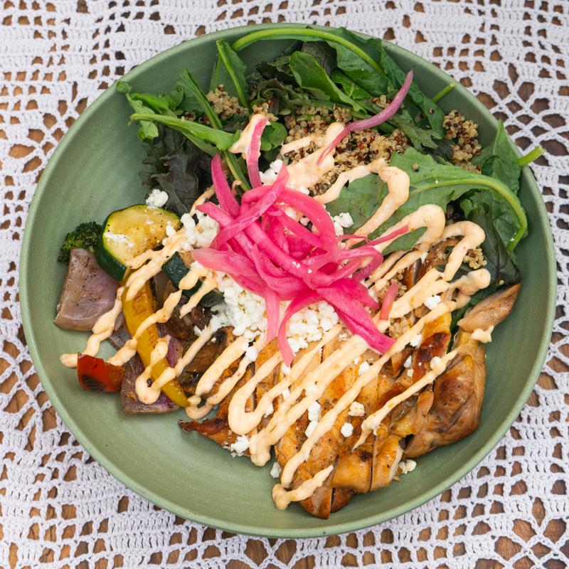 Quinoa, house smoked chicken, seasonal roasted veggies, avocado, kale, pickled onions, crumbled goat cheese drizzled with cherry pepper aioli *Gluten Free