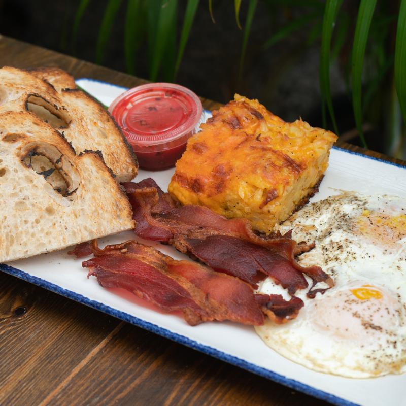 2 eggs your way, bacon or house made maple sage sausage patties, cheesy hash brown casserole, and toast *Gluten Free Available