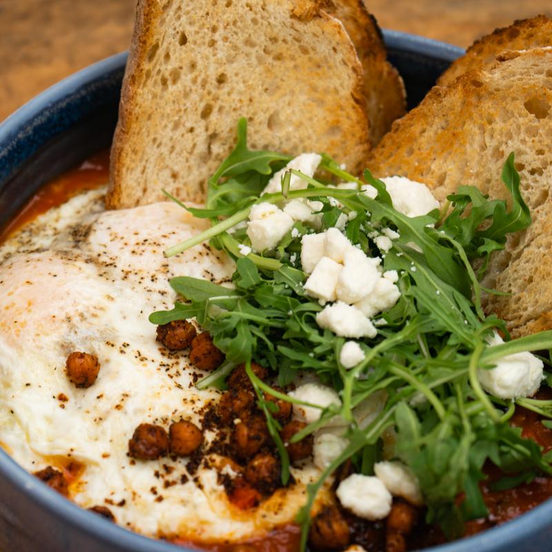 House-smoked spiced pepper tomato sauce topped with two over easy eggs, crispy chickpeas, crumbled feta, arugula & sourdough toast *Vegetarian, Gluten Free Available