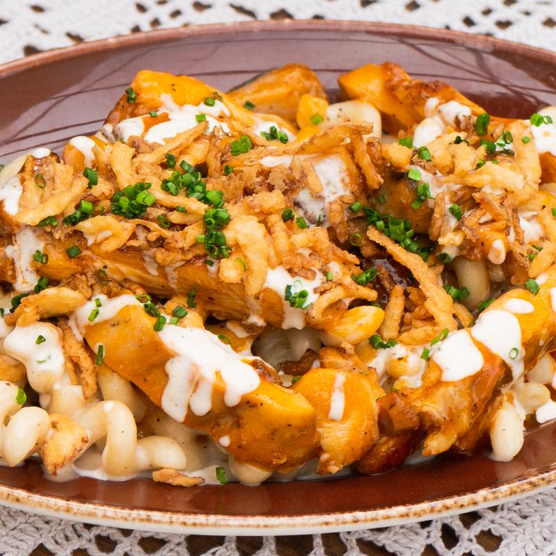 House cheese sauce with cavatappi pasta topped with smoked chicken, buffalo sauce, house ranch, crispy onions & chives