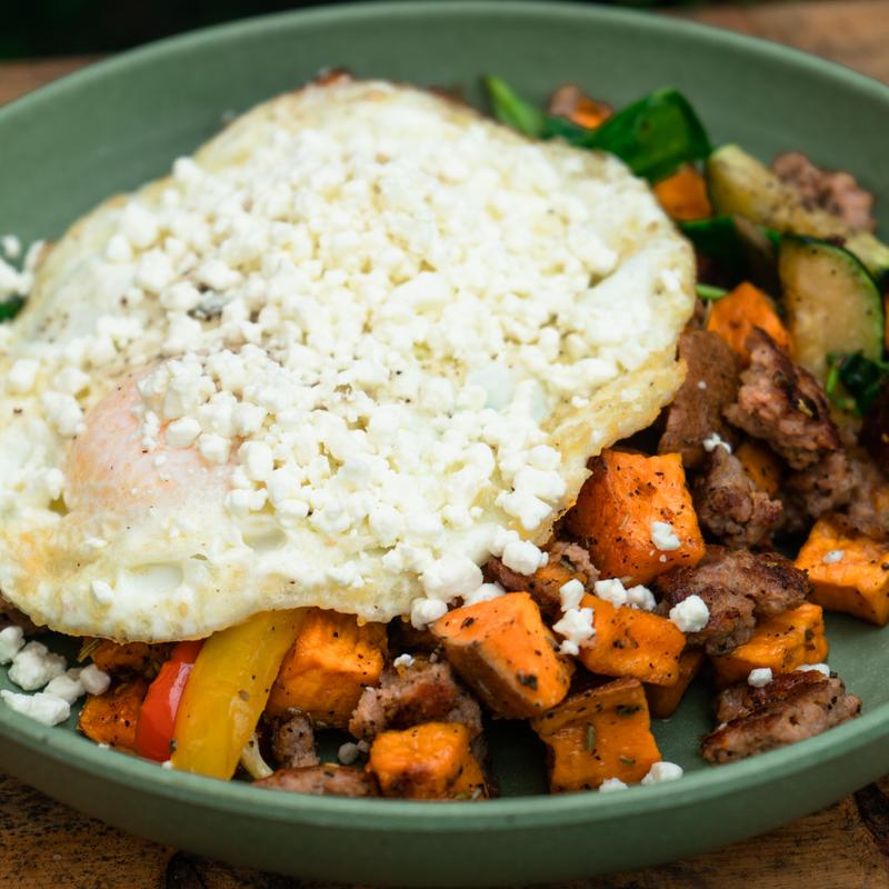 Diced sweet potatoes, maple sage sausage, spinach, goat cheese, ten eggs