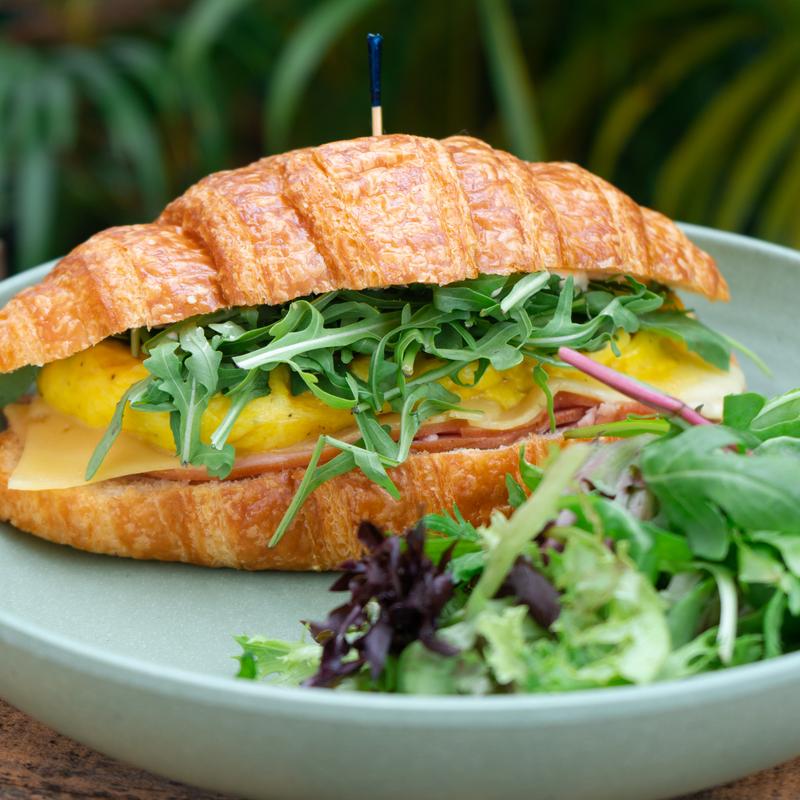 Scrambled egg, gouda, deli ham, Bloom mayo & arugula on a buttery croissant