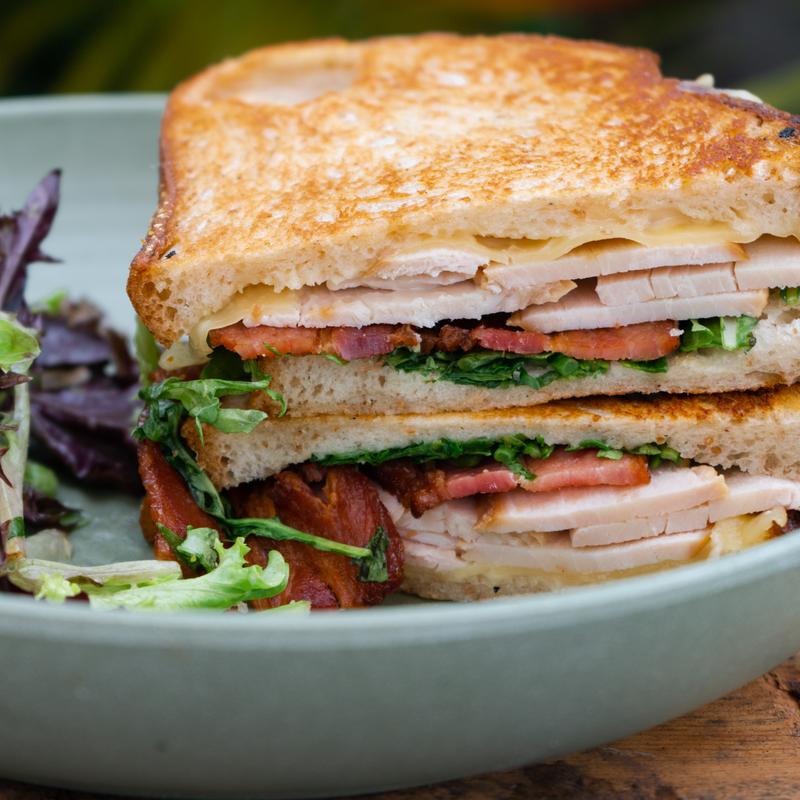 House smoked turkey breast, bacon, gouda, garlic aioli, arugula, on pressed sourdough *Gluten Free Available